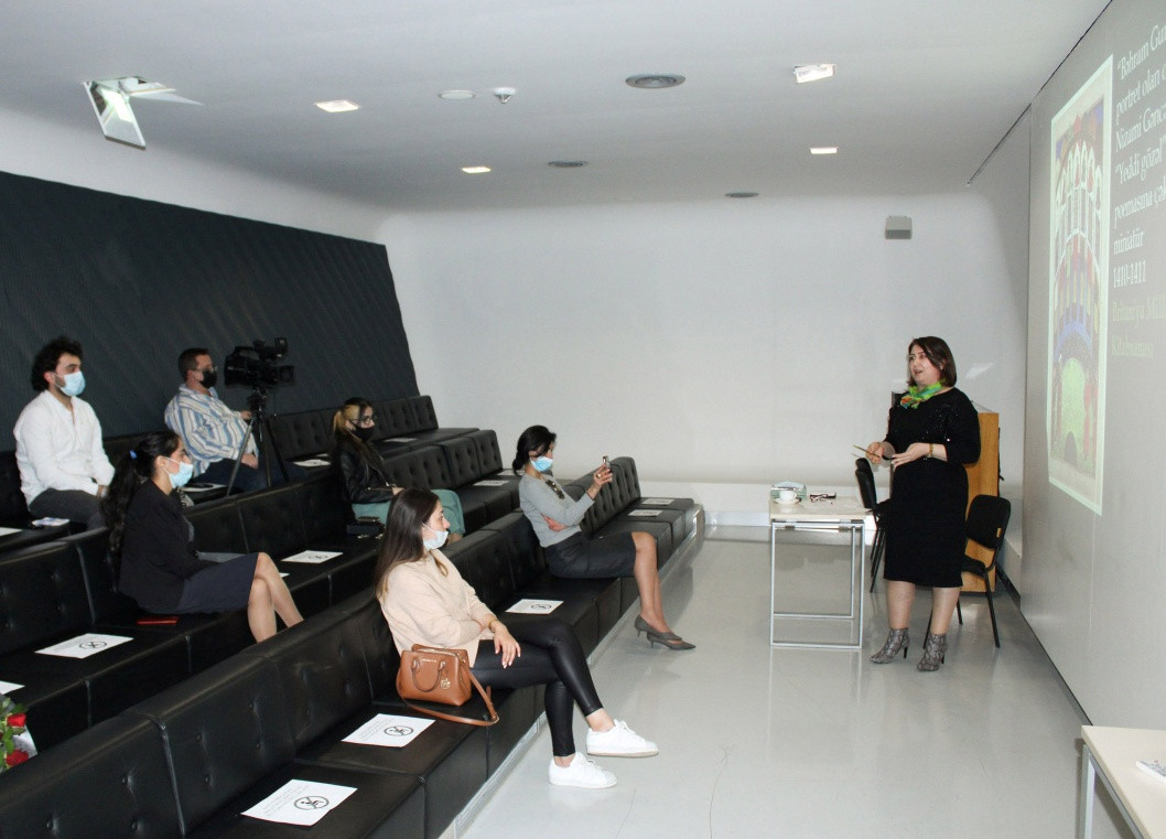 Azərbaycan Milli Xalça Muzeyində filologiya üzrə fəlsəfə doktoru, dosent Təhminə Bədəlovanın “Nizami Gəncəvi yaradıcılığında sənət və sənətkarlar” adlı mühazirəsi keçirilib. Təhminə xanım dahi şairin öz əsərlərində şairlik, rəssamlıq, memarlıq, musiqi, xalçaçılıq, daşyonma və s. kimi müxtəlif sənət sahələrinə, sənətkarlara verdiyi yüksək dəyərdən, onların özünəməxsus cəhətləri barədə fikirlərindən danışıb. O, mövzu ilə bağlı görkəmli söz ustadı N.Gəncəvinin yaradıcılığından maraqlı nümunələr səsləndirib. T.Bədəlova sonda mühazirə iştirakçılarının suallarını cavablandırıb, onlara həmçinin muzeyimizin kitabxanasına müəllifi olduğu "Nizami Gəncəvi və "Kəlilə və Dimnə" motivləri" kitabını hədiyyə edib.