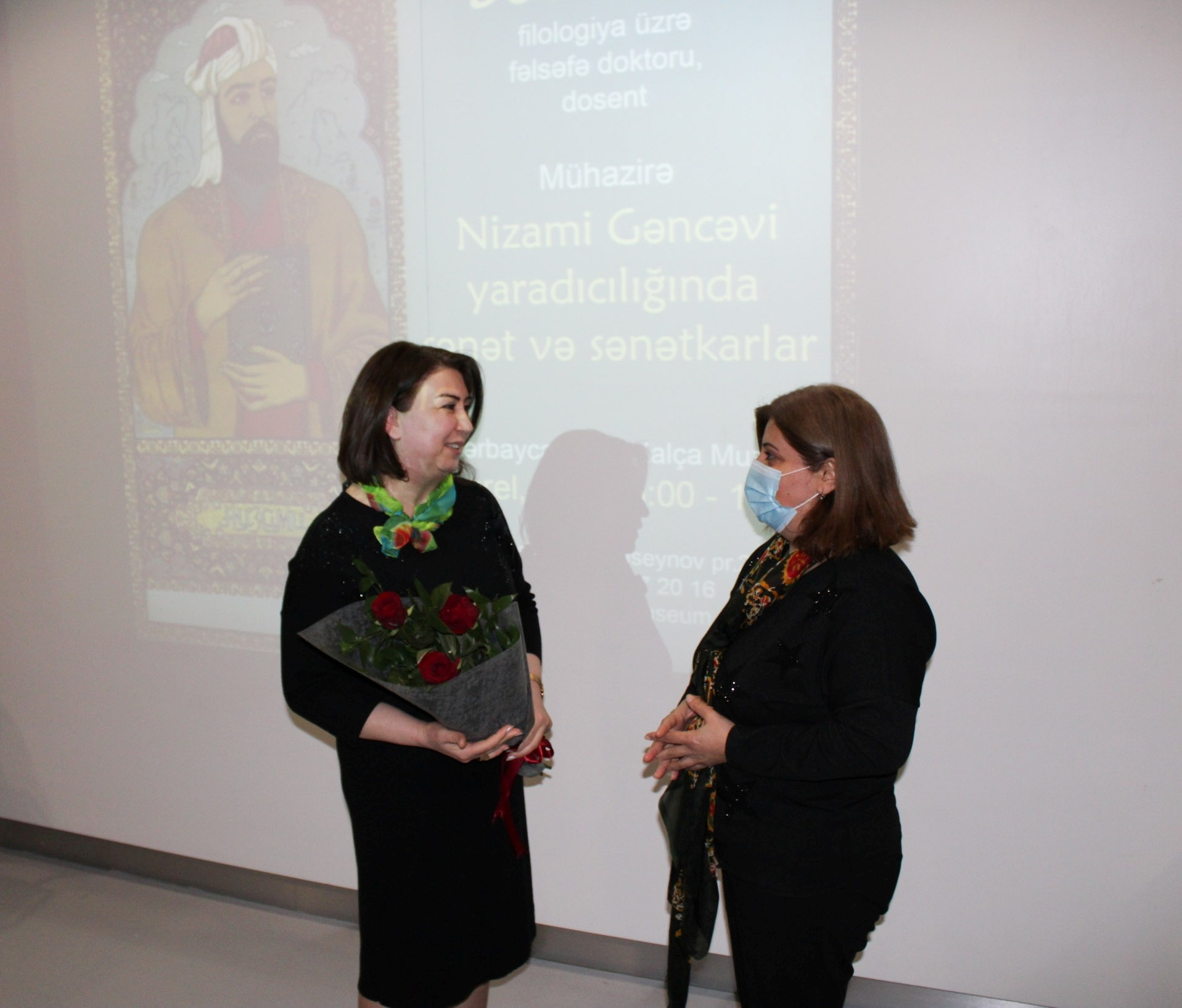 Azərbaycan Milli Xalça Muzeyində filologiya üzrə fəlsəfə doktoru, dosent Təhminə Bədəlovanın “Nizami Gəncəvi yaradıcılığında sənət və sənətkarlar” adlı mühazirəsi keçirilib. Təhminə xanım dahi şairin öz əsərlərində şairlik, rəssamlıq, memarlıq, musiqi, xalçaçılıq, daşyonma və s. kimi müxtəlif sənət sahələrinə, sənətkarlara verdiyi yüksək dəyərdən, onların özünəməxsus cəhətləri barədə fikirlərindən danışıb. O, mövzu ilə bağlı görkəmli söz ustadı N.Gəncəvinin yaradıcılığından maraqlı nümunələr səsləndirib. T.Bədəlova sonda mühazirə iştirakçılarının suallarını cavablandırıb, onlara həmçinin muzeyimizin kitabxanasına müəllifi olduğu "Nizami Gəncəvi və "Kəlilə və Dimnə" motivləri" kitabını hədiyyə edib.